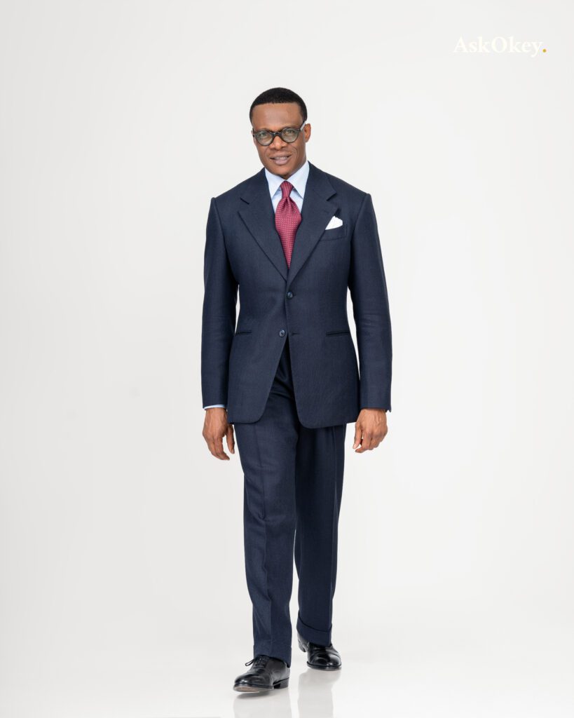 The key is the ratio. The “golden ratio” gives us one third above the waist and two thirds below it. By “waist”, we mean a man’s natural waist, just above his navel. We also want to see a narrower outline below the waist (hips and legs), compared to the width of the shoulders – at least a straight line downwards from the shoulders or edge of the lapels. Many of us do not have that sought-after inverted triangle shape, but we can still achieve a straight line from shoulder to cuff, in a well-designed jacket and trousers.