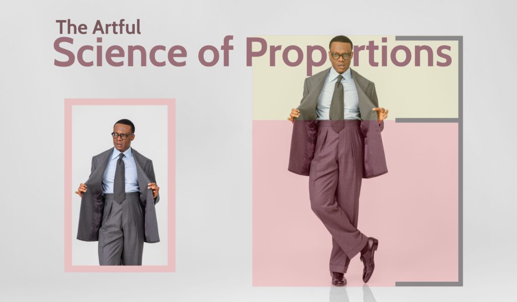 What factors affect the proportions of a garment or assembly of garments? First, proportions should not be confused with style. A jacket or suit may be cut in a certain way, accentuating the shoulders or narrowing the waist. Regardless, the style contributes or should contribute to the garment’s proportions.
