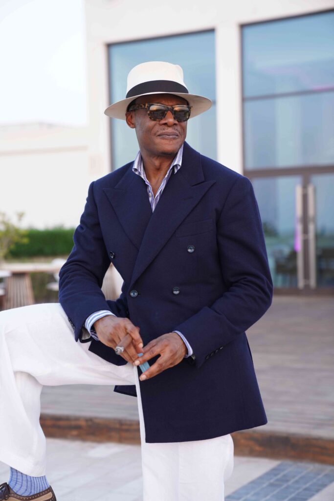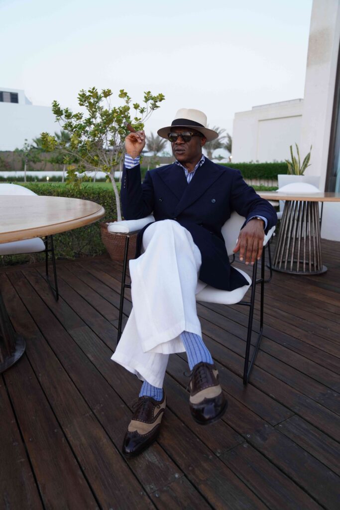 Sixth, trousers: To wreck all the effort you have made on cut, fabric and accessories, just wear a pair of old trousers from your cupboard – for example, those grey trousers that hug your legs. All wrong for a well-designed and expertly tailored blazer. You need trousers that hang, as opposed to clinging to you. They need to hang straight, continuing the line from your shoulders through your waist. Consider a pair of grey or fawn flannels. For casual, tieless occasions, cotton trousers work, white if you are going to wear the blazer during the day. Just make sure that they hang.